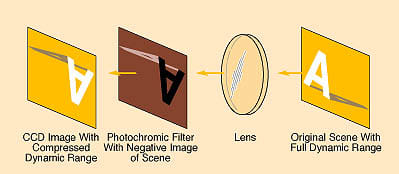 To address this issue, the proposed solution involves the use of a photochromic filter placed at or near the CCD image plane. Photochromic materials, which darken in response to bright light (similar to self-adjusting sunglasses), can selectively reduce the intensity of bright regions in an image. This localized darkening allows the dynamic range of the captured image to be compressed, enabling the CCD to record details across a broader spectrum of brightness levels.