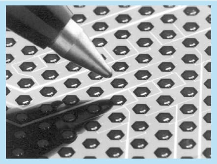 A feed-horn-coupled monolithic array of micromesh bolometers is undergoing development for use in a photometric camera. The array is designed for conducting astrophysical observations in a wavelength band centered at 350 μm. The bolometers are improved versions of previously developed bolometers comprising metalized Si3N4 micromesh radiation absorbers coupled with neutron-transmutation-doped Ge thermistors. Incident radiation heats the absorbers above a base temperature, changing the electrical resistance of each thermistor. In the present array of improved bolometers (see figure), the thermistors are attached to the micromesh absorbers by indium bump bonds and are addressed by use of lithographed, vapor-deposited electrical leads. This architecture reduces the heat capacity and minimizes the thermal conductivity to 1/20 and 1/300, respectively, of earlier versions of these detectors, with consequent improvement in sensitivity and speed of response.