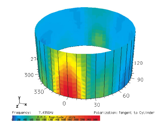 From the cylindrical profile it can be seen that the worst position for the emissions is from the side at 3.2 GHz. These locations for the maximum emissions correspond well with measured data. Figure 2 shows the electric field pattern produced by the transceiver at the same frequency, monitored with a horizontal plane through the center of the transmit/ receive ports.