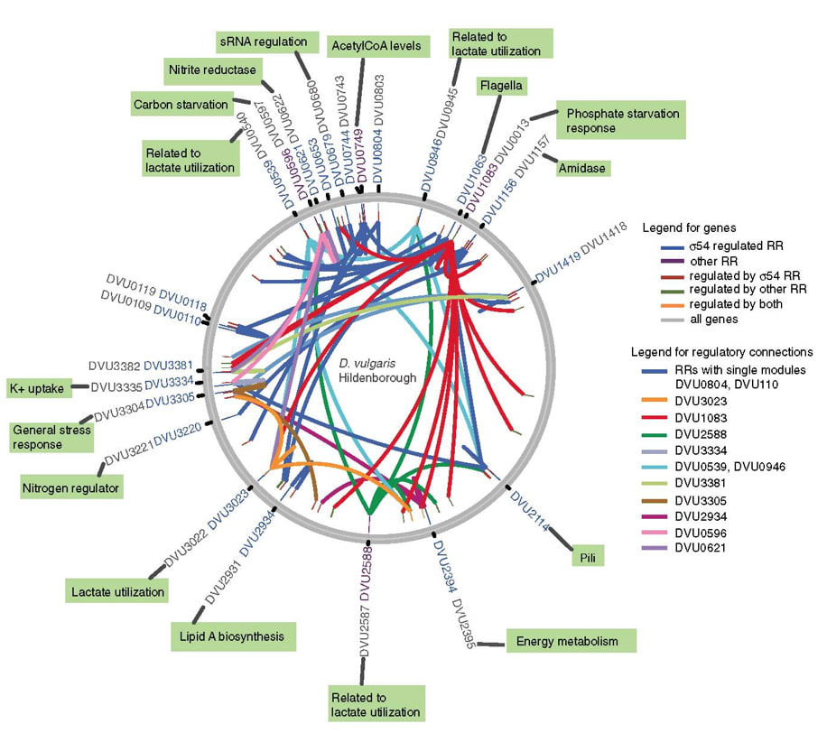 Mukhopadhyay and her team bypassed the need to know the signal activation conditions and mapped virtually the entire D. vulgaris gene response network through genome-wide in vitro experimental determinations. They accomplished this using a “DNA-Affinity-Purified-chip (DAP-chip) strategy” they devised, in which purified response regulator proteins are incubated with genomic DNA and used to enrich DNA regions that bind to them. Both the enriched and the starting input DNA are amplified, pooled, and hybridized in a customized D. vulgaris microarray to determine enriched gene targets.