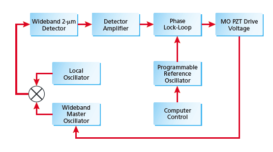 Figure 1. Tm,Ho:YLF MO/LO Offset Locking System incorporates the described improvements. Efforts to date have focused on development of Tm,Ho:YLF lasers operating near 2.05 μm, which have much potential for both efficient space-based wind lidar systems and CO2 DIAL measurements. The locking techniques are readily applicable to any number of other wavelengths and laser formats.
