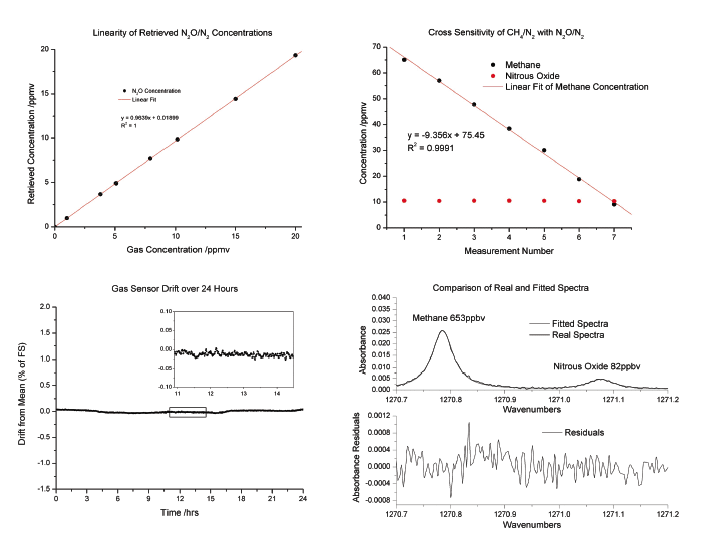 Sensor drift was assessed by passing a fixed concentration of determined gas (N2O) through the sensor for a period of four hours. The reading drift during that period was less than 2 ppb. Finally, the recorded spectral features for both N2O and CH4 were compared with theoretical predictions. RMS residuals were equivalent to less than 600 ppt in a 1-Hz bandwidth, providing strong evidence of the ultimate noise performance of the QCL gas sensor technology.