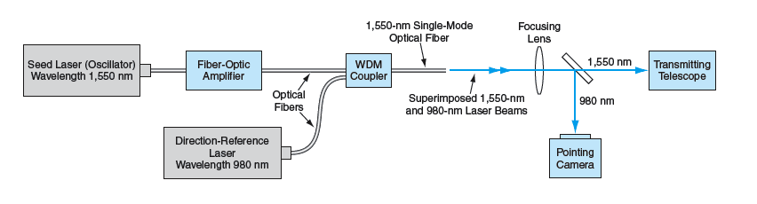 We have applied this idea to a particular system that transmits at the standard telecommunication wavelength of 1,550 nm and uses a silicon-based sensor, sensitive from 0.5 to 1.0 micrometers, to determine the pointing direction. The scheme shown in the figure involves integrating a low-power 980-nm reference or boresight laser beam coupled to the 1,550-nm transmit beam via a wavelength-division-multiplexed fiber coupler. Both of these signals propagate through the optical fiber where they achieve an extremely high level of co-alignment before they are launched into the telescope. The telescope uses a dichroic beam splitter to reflect the 980-nm beam onto the silicon image sensor (a quad detector, charge-coupled device, or active-pixel-sensor array) while the 1,550-nm signal beam is transmitted through the optical assembly toward the remotely located receiver. Since the 980-nm reference signal originates from the same single-mode fiber-coupled source as the transmit signal, its position on the sensor is used to accurately determine the propagation direction of the transmit signal.