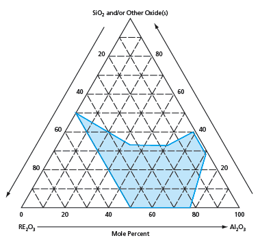 Alternatively, a relatively large amount of glass can be formed in a conventional float glass process: First, the oxide ingredients are melted together in a crucible. Then the glass melt is cast onto a pool of a suitable molten metal (e.g., tin or gold) that remains molten (and, therefore, not crystalline) at a temperature below the temperature to which the glass melt must be rapidly cooled. Another alternative for making a relatively large amount of glass is to melt the ingredients in a crucible, then cast the melt onto a pre-cooled metal die. Some heterogeneous nucleation of crystals can occur in the glass layer in contact with the metal. However, if the rate of cooling is fast enough (in effect, if the casting is thin enough), then glass is formed before the crystals propagate through the thickness of the casting. Later, any crystals can be removed by polishing the glass surface that was in contact with the metal die.