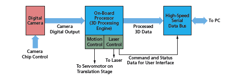 Figure 2 is a block diagram of the electronic system of the instrument. The system includes an onboard processor, plus an external personal computer (PC) for further processing of the acquired data and displaying resulting depth maps. The processor is capable of generating 3D data in real time, eliminating the need for both onboard memory and post-processing to generate 3D data. The 3D data output of the onboard processor is sent to the PC via a high-speed serial data-communication link. By reducing the computational burden on the PC, onboard preprocessing enables the PC to create and display 3D images in real time during scanning.