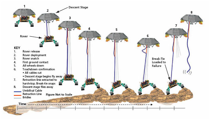 The landing scheme for NASA’s next-generation Mars rover will encompass a novel landing technique (see figure). The rover will be lowered from a rocket-powered descent stage and then placed onto the surface while hanging from three bridles. Communication between the rover and descent stage will be maintained through an electrical umbilical cable, which will be deployed in parallel with structural bridles.