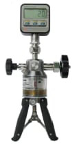The P100 gauge and handheld pumps from E Instruments International (Langhorne, PA) offer pressure calibration with ranges to 1000 bar. The hydraulic pumps display engineering units in bar, Mpa, Kpa, Psi, and mbar. Accuracy is ±0.20% of full scale or ±0.05% of full scale. Other features include fine-adjustment Vernier, positive and negative peak function, pressure release valve, and a spring-loaded handle.