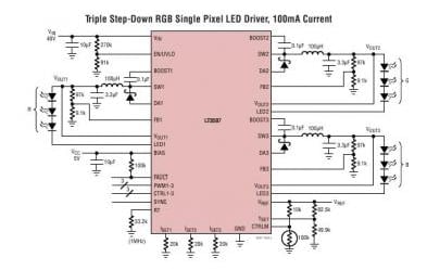 The LT3597 from Linear Technology ((Milpitas, CA) is a 60-V triple step-down LED driver capable of achieving 10,000:1 digital PWM dimming at 100 Hz with fast NPN current sources driving up to 10 LEDs in each channel. LED dimming can also be achieved via analog control of the CTRL1-3 pin.