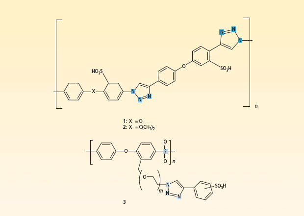 The sulfonic acid group in polyoxyphenylene triazole sulfonic acid is a strong acid capable of generating protons when presented with a suitable base. The triazole moiety offers at least three base sites for protonation. The polyoxyphenylene backbone is endowed with excellent thermal stability, as evidenced by the numerous engineering polymers, incorporating this and related backbones, that can withstand operating temperatures up to 300 °C. Also, polymers that have similar backbones [poly(arylene ether ether ketone) and poly(arylene ether sulfone)] have been reported to be electrochemically stable. Hence, the proposed polymers are expected to exhibit high thermal and electrochemical stability.