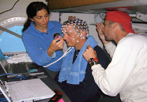 Astronauts/aquanauts apply a net with electrodes for an electroencephalogram (EEG) study as part of the ninth NASA Extreme Environment Mission Operations (NEEMO). NASA’s astronauts must be able to perform at peak productivity during extended stays in space. Glenn’s Human Research Program is working to develop medical capabilities that can improve every astronaut’s ability to monitor health risks, respond to emergencies, and remain healthy during and after extended space travel.
