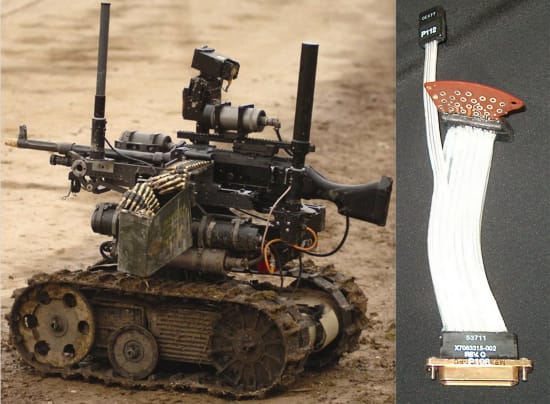 The highly flexible and durable flat silicone cables from Cicoil (Valencia, CA) are designed for use on unmanned ground-based military robotic vehicles that require absolute reliability in mission critical and extreme environment conditions. Unlike bulky and stiffer round cables, Cicoil’s flat silicone cables provide space and weight savings, enhanced flexibility, greater current carrying capacity, reduced skewing effects, and better electrical characteristics.