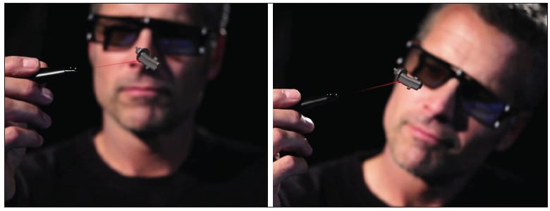 Today, real 3D visualization is experienced through several components of a complex system: an interactive display, head tracking to monitor the user’s real-time movement, and a stylus to interact with 3D objects. To create the 3D effect, the display alternates left- and right-eye images filtered by polarized glasses. The glasses allow only the intended image to reach each eye and provide a reference point for head tracking, so one can move and look at an object from different angles and perspectives. The stylus beam allows the user to select and grasp the object, which appears free floating in space, in much the way that a mouse allows two-dimensional manipulation of flat drawings (see Figure 1). The object can appear in front of or behind the display. This experience lies at the heart of virtual holography.
