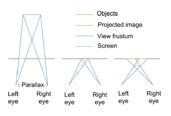 By contrast, a 2D image that provides both monocular and binocular cues is referred as a stereoscopic 3D image. The canvas of a monoscopic 3D image is a flat and static surface. The canvas for a stereoscopic 3D image becomes a window through which a dynamic 3D environment appears, due in part to the concept of parallax, where 3D objects can appear far away (behind the screen) or close by (in front of the screen) (see Figure 2). In order to generate a 2D image that adds binocular cues, one needs to supply the left and right eyes with separate images that closely correspond to the images the eyes would see were they looking at the real object. When the brain is presented with left and right eye images, it fuses them into a single image that has strong depth perception.