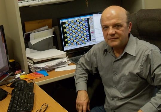 UCF Professor Sergey Stolbov and postdoctoral research associate Marisol Alcántara Ortigoza focused on making gold and palladium better suited for the reaction. They created a sandwich-like structure that layers cheaper and more abundant elements with gold and palladium and other elements to make it more effective. The outer monoatomic layer (the top of the sandwich) is either palladium or gold. Below it is a layer that works to enhance the energy conversion rate but also acts to protect the catalyst from the acidic environment. These two layers reside on the bottom slice of the sandwich — an inexpensive substrate (tungsten), which also plays a role in the stability of the catalyst.