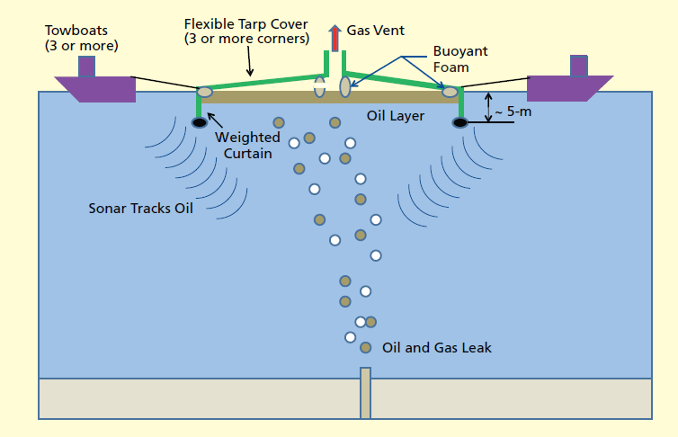A second design version has a flexible pyramid cover that is attached by lines to ballast on the ocean floor. This is similar to fixed, metal pyramid oil capture devices in the Santa Barbara Channel off the coast of California. The ballast lines for the improved design, however, would have winches that can move the pyramid to always be located above the oil and gas plume.