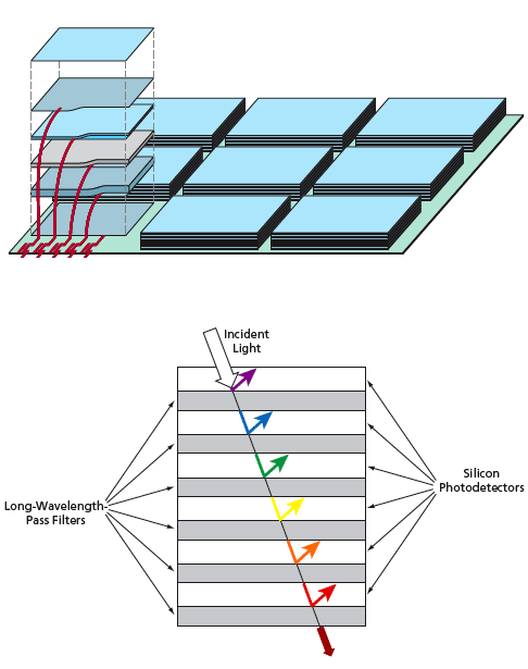 The design of the heterostructure would exploit the fact that within the visible portion of the spectrum, the characteristic depth of penetration of photons increases with wavelength. Proceeding from the front toward the back, each successive long-wavelength-pass filter would have a longer cutoff wavelength, and each successive photodetector would be made thicker to enable it to absorb a greater proportion of incident longer-wavelength photons.
