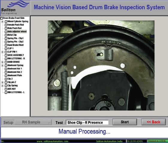 Software played a critical role in the success of the system. Some visual variations in components are considered normal for an “under the hood” application. In addition, the presence, absence, or shift in position of the components in the background affects detection of components, and shifting of the brake shoes — though limited to an extent by the centralizing mechanism — also poses a challenge.