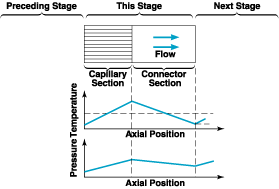 The design features a capillary section and a connector section. The capillary section, made from a silica aerogel membrane, allows gas to flow through tiny pores, while the connector section maintains a constant pressure as the gas temperature decreases before entering the next stage. The temperature gradient is crucial for the operation of the compressor, as it drives the thermal transpiration process. The document highlights that the efficiency of the compressor increases as the flow transitions from the continuum to the free-molecular regime.