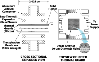 The prototype described includes two silicon chips functioning as thermal guards, which can be heated or cooled to create the necessary temperature differential across the aerogel membrane. The aerogel's low thermal conductivity and small pore size are essential for effective thermal transpiration. The design also incorporates low-thermal-expansion glass plenums and aluminum vacuum connectors, ensuring stability and performance.