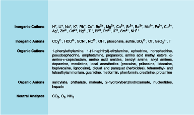 The figure depicts an example of proposed compact water-quality sensors that would contain integrated arrays of ion-sensitive electrodes (ISEs). These sensors would serve as electronic "tongues": they would be placed in contact with water and used to "taste" selected dissolved ions (that is, they would be used to measure the concentrations of the ions). The selected ions could be any or all of a variety of organic and inorganic cations and anions that could be regarded as contaminants or analytes, depending on the specific application. In addition, some of the ISEs could be made sensitive to some neutral analytes (see table).