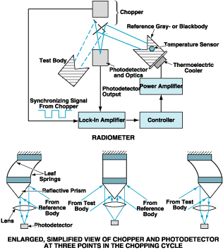 The AC component of the photodetector output would be fed to a lock-in amplifier. The reference or synchronization signal for the lock-in amplifier would be derived from a device that monitored the motion of the chopper. The output of the lock-in amplifier would be a rectified signal approximately proportional to the difference between the radiances of the test body and the reference body. This signal would be used as an error signal in a feedback control loop, which would adjust the power supplied to the temperature-control device and thereby adjust the temperature of the reference body in an effort to reduce the error to zero. The temperature of the reference body would be measured by any of a variety of commercially available contact temperature sensors, which can routinely afford accuracy and long-term stability within 0.1 K. Hence, as long as the error voltage remained at zero and assuming that the emissivities and other radiant properties of the test and reference bodies were sufficiently similar, it could be assumed that the measured reference-body temperature was a close approximation of the test-body temperature.