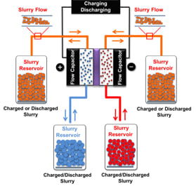 Uncharged slurry is pumped from its tanks through a flow cell, where energy stored in the cell is then transferred to the carbon particles. The charged slurry can then be stored in reservoirs until the energy is needed, at which time the entire process is reversed in order to discharge the EFC. The main advantage of the EFC is that its design allows it to be constructed on a scale large enough to store large amounts of energy, while also allowing for rapid disbursal of the energy when the demand dictates it.