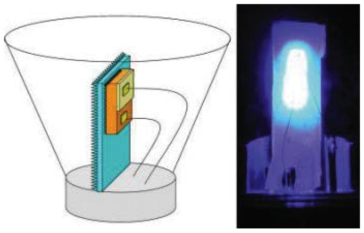 LED chips are made from layers of doped semiconductors sandwiched together. When a voltage is applied across the layers, electrons and holes (an absence of electrons) migrate toward an area of the LED called the active layer, where they combine, begetting a photon in the process. In most commercially available blue LEDs, the crystals that make up the semiconductor layers are grown in a flat orientation called the c-plane. This traditional orientation of the crystals, however, may create electrical fields that interfere with the reunion of the electrons and holes.
