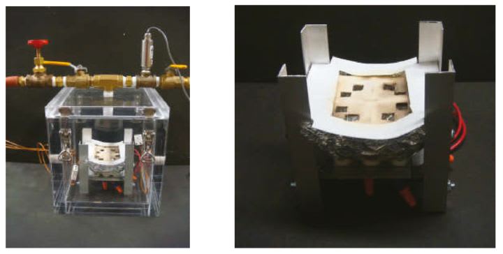 The material chosen for the sample coupons was silicon, due to its favorable properties for this application. Silicon is chemically and biologically inert, and has very high thermal conductivity. Furthermore, silicon has high emissivity in the visible and near-infrared portion of the electromagnetic spectrum, and has a lower emissivity in the mid-infrared range. This means that the silicon coupons are able to absorb a significant portion of the radiation output by the halogen light bulbs, but not re-radiate much midinfrared radiation at the sample temperatures. This unique property of silicon allows for the sample coupons to be heated very quickly and accurately using the radiant heat from the halogen light bulbs. Furthermore, due to the widespread use of silicon in the microelectronics industry, silicon was available in very thin wafers. The low thermal mass of the thin wafers helped them heat up very quickly.