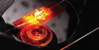 Zinc oxide microwires were used by Georgia Tech researchers to improve the efficiency at which gallium nitride light-emitting diodes (LEDs) convert electricity to ultraviolet light. By applying mechanical strain to the microwires, the researchers created a piezoelectric potential in the wires, and that potential was used to tune the charge transport and enhance carrier injection in the LEDs. This control of an optoelectronic device with piezoelectric potential — or piezo-phototronics — represents another example of how materials that have both piezoelectric and semi conducting properties can be controlled mechanically.