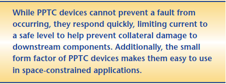 While PPTC devices cannot prevent a fault from occurring, they respond quickly, limiting current to a safe level to help prevent collateral damage to downstream components. Additionally, the small form factor of PPTC devices makes them easy to use in space-constrained applications.