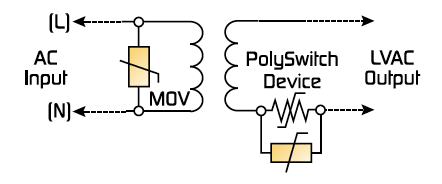 A variety of circuit protection devices can help protect Class 2 power sources for LED lighting applications. Figure 2 illustrates how a coordinated circuit protection strategy, employing an MOV on the AC input and a PolySwitch device on an output circuit branch, can help manufacturers meet the requirements of UL1310 paragraph 35.1 overload test for switches and controls.