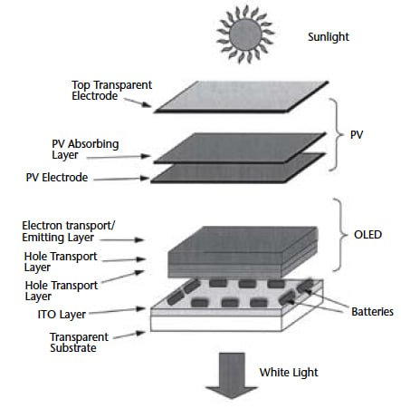 Working inward, the next stratum generates power and includes a PV absorbing layer and PV electrode. Following this is the energy-utilizing component, an OLED layer that allows for the transportation and emission of electrons. Finally, an indium tin oxide (ITO) layer — flanked by batteries — rests atop the system's transparent substrate. With vast market potential, the invention could substantially reduce residential and commercial energy costs.