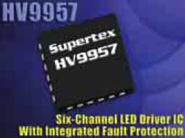 The HV9957 from Supertex (Sunnyvale, CA) combines a switch-mode boost converter and six low-dropout, linear current regulators to deliver high efficiency and precise current control in an LED driver. The IC can drive up to six strings of LEDs at 30 mA each, which is well-suited for battery-powered LED backlighting applications. Temperature-triggered fault protection combined with an outlier approach to identify faulty strings overcomes problems inherent with ordinary fault protection. Faulty strings are turned off only when absolutely necessary. HV9957 provides protection from fault conditions such as over- and under-voltage supply, over-current, and over-temperature.