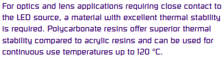 Polycarbonate resins offer superior thermal stability compared to acrylic resins and can be used for continuous use temperatures up to 120 °C.