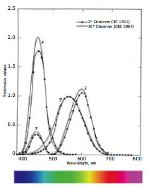 Tristimulus colorimetry is based on the three component theory of color vision, which states that the eye possesses receptors for three primary colors (red, green, and blue) and that all colors are seen as mixtures of these three primary colors. The most important system is the 1931 Commission Internationale I’Eclairage (CIE) system, which defined the standard observer to have color-matching functions x(λ), y(λ), and z(λ). The XYZ tristimulus values are calculated using these three standard observer color-matching functions. XYZ tristimulus values and the associated Yxy color space form the foundation of the present CIE color space.