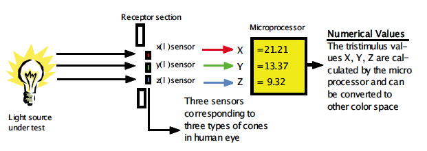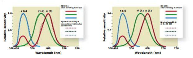 Tristimulus colorimeters are commonly referred to among industry professionals as “filter-based instruments.” They are desired for certain properties such as cost, speed, and portability; however, they contain inherent design limitations which yield them an unsuitable choice for all measurement applications. Colorimeters receive information from three filtered light sensitive sensors which mimic the response of the three cone receptors in the human eye. Fitting the filters' response to that of the normal human eye as described by the CIE 1931 standard observer color-matching functions is subject to limitations or conditions present during the manufacturing of the filters. Therefore, filter-based instrumentation is susceptible to finite errors because of the deviation of the filter response from the ideal human eye response.