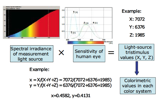 Hence, the spectroradiometric method is the most accurate and complete method of specifying color. The spectral data can be analyzed visually and/or compared to data from another light source. However, the best use of spectral data with respect to color measurement is to calculate the CIE tristimulus values by mathematically integrating the data with the CIE colormatching function. The tristimulus values are then used to compute CIE chromaticity coordinates and luminosity, which provide complete description of the color.