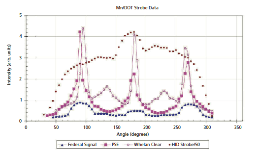 The results of this study are generally mixed. First, it is clear from the data that the low power benefit of LED lights can be realized under specific conditions. For similar visibility conditions, the LED lights performed as well — or in some cases better — than the HID strobe. Viewed directly from the rear, side, or front of the plow vehicle, it appears that LED-based strobes can be made to be equally conspicuous while reducing the costs associated with high power, maintenance, and reliability issues.