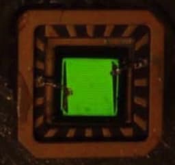 A p-i-n diode structure device has been synthesized which, when forward biased, functions as an LED that emits green light well within the green gap (see image). This device essentially operates a solar cell in reverse, and is not optimized for production of light. Regardless, the device produces a deep green at the peak of the green gap.