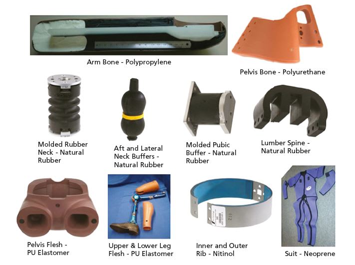 The rate-sensitive foam material finite element model is used for the foams in the dummy. This model allows for direct input of stress-strain data at each strain rate for both tension and compression. A user material that simulates super-elastic behavior is used to model both the inner and outer Nitinol ribs. Hyperelastic material models are used in conjunction with a viscoelastic model (to account for strain rate effects) to simulate the rubber-like materials.