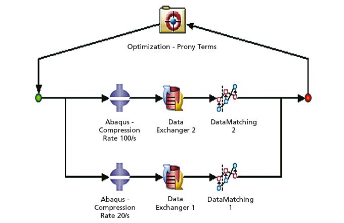 The next step was to calibrate the strain rate effects in the hyperelastic material. The viscoelastic part of the material response was modeled using a Prony series expansion of the dimensionless relaxation modulus. The Prony series coefficients were calibrated using a simulation process automation and design optimization software package that provides a suite of visual and flexible tools for creating simulation process flows (sim-flows) to automate the exploration of design alternatives and to identify optimal performance parameters.