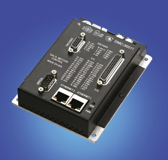 The DMC-30017 Pocket Motion Controller Series from Galil Motion Control (Rocklin, CA) combines a single- axis motion controller with a 6A microstepping drive, which operates a two-phase bipolar stepper motor. The drive produces 256 microsteps per full step, or 1024 steps per full cycle, resulting in 51,200 steps/rev for a standard 200-step motor. The maximum step rate generated by the controller is 3 million microsteps/second. It drives motors operating at up to 6 amps at 20 to 80 VDC. The unit measures 3.9 x 5.0 x 1.5".