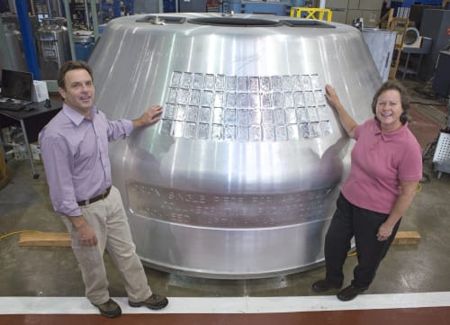 Marcia Domack and John Wagner, engineers in the Advanced Materials and Processing Branch at NASA Langley Research Center, have worked with Boston-based metal fabricator Spincraft, focusing on a one-piece manufacturing process called spin forming. The team used the spin-forming technique to create a model of the forward pressure vessel bulkhead (FPVBH) of an Orion-type crew module.