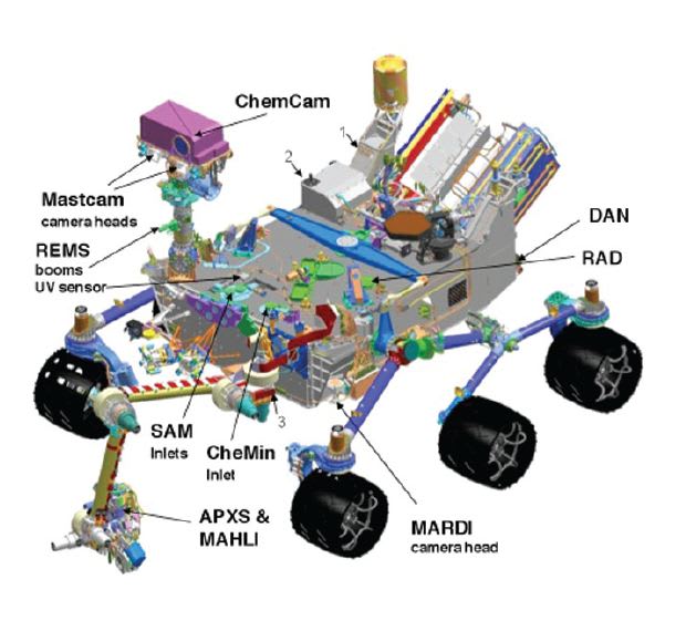 The ten instruments on Curiosity have a combined mass of 165 pounds. Curiosity carries the instruments plus multiple systems that enable the science payload to do its job and send home the results. Key systems include six-wheeled mobility, sample acquisition and handling with a robotic arm, navigation using stereo imaging, a radioisotope power source, avionics, software, telecommunications, and thermal control.