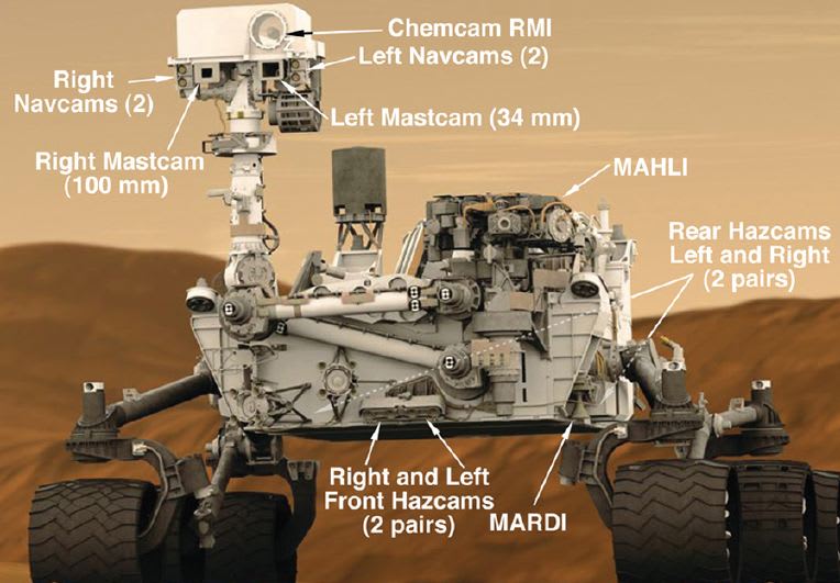 MAHLI is a focusable color camera on Curiosity’s turret. Researchers will use it for magnified, close-up views of rocks and soils, and also for wider scenes of the ground, the landscape, or even the rover. Essentially, it is a handheld camera with a macro lens and autofocus.
