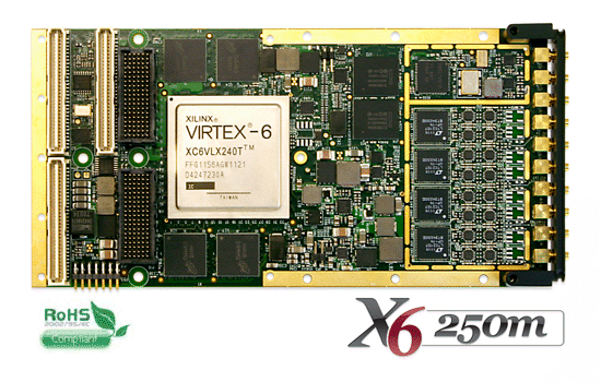 Innovative Integration (Simi Valley, CA) has announced the new X6-250M that integrates digitizing with signal processing on a PMC/XMC IO module. The module has a powerful Xilinx Virtex 6 FPGA signal processing core, and high performance PCI Express/PCI host interface. Applications include software defined radio, RADAR receivers, and multi-channel data recorders. The X6-250M has eight simultaneously sampling A/D channels that sample at rates up to 310 MSPS (14-bit). The A/D have matched input delays and response and are supported by a programmable sample clock PLL and triggering that support multi-card synchronization for large scale systems. A Xilinx Virtex6 SX315T (LX240T and SX475T options) with 4 banks of 1GB DRAM provide a very high performance DSP core with over 2000 MACs (SX315T).