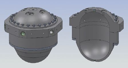 The pressure dome consists of two machined segments. An O-ring is placed in an O-ring groove in the flange of the bottom segment and is trapped by the flange on the top dome segment when these components are bolted together with high-strength bolts. The pressure dome has several unique features. It is made (to ASME Pressure Vessel guidelines) in a high-strength aluminum alloy with the strength of stainless steel and the weight benefits of aluminum. The flange of the upper dome portion contains specially machined flats for mounting the dome, and other flats dedicated to the special feedthroughs for electrical connections. A pressure dome can be increased in length to house larger stacks (more cells) of the same diameter with the simple addition of a cylindrical segment.