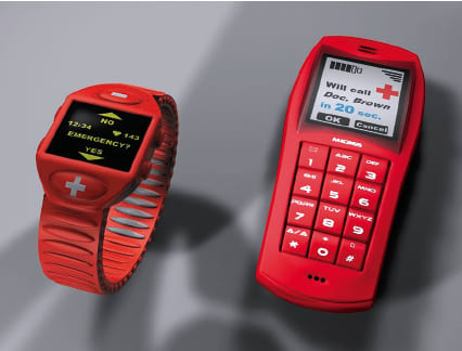 If the wearer doesn’t move for a specific length of time or other body parameters go out of normal limits, the watch asks the user if there is an emergency. If the user does not answer to the display and sound signals of the watch, the watch contacts a predefined person such as a physician through the cell phone, which introduces itself as an automatic system, providing the name and location of the wearer. The location also can be determined by the location of the cell phone.
