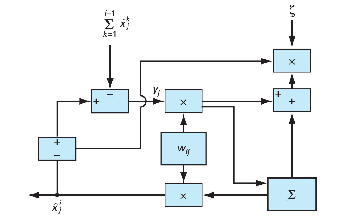 The figure depicts a hardware architecture for implementing DOGEDYN. The raw input data, here denoted xj, are subtracted from the sum of the data previously projected on the previous principal components to obtain yj (which is equivalent to yt as defined above, after appropriate changes in subscripts). The Σ box calculates the inner product of vectors y and wi. The output of the Σ box is summed with the previously computed product of yj and wij and the result multiplied by the dynamic learning rate before updating of wij.