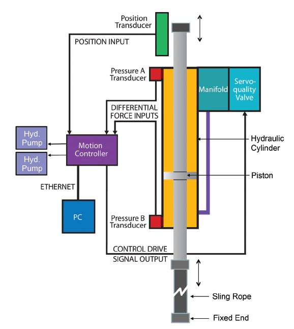 The rope sling is tensioned using a double-ended hydraulic cylinder with a 3.25" bore, 2" rod, and 2' stroke, with fluid supplied by a proportional servo valve. The motion control unit controlled the valve and two hydraulic pumps. The pressure sensors were mounted on the cylinders and magnetostrictive displacement transducers (MDTs) with synchronous serial interfaces (SSI) to the motion controller were mounted externally on the double-ended hydraulic pulling cylinder. Figure 3 shows the major components of the 150- foot-long test apparatus (just one side of a double-sided testbed was used for these tests).